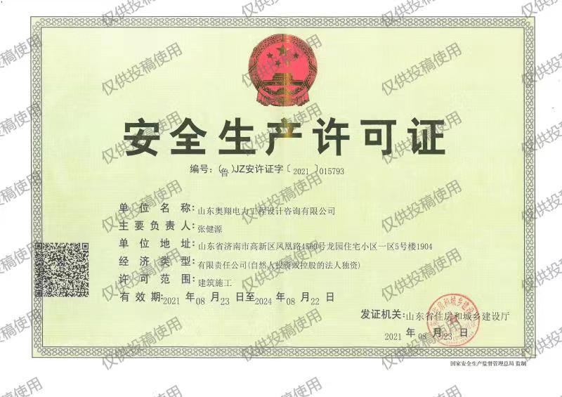 8月26日,山東奧翔電力工程設(shè)計咨詢有限公司正式取得由山東省住房與城鄉(xiāng)建設(shè)廳頒發(fā)的安全生產(chǎn)許可證。